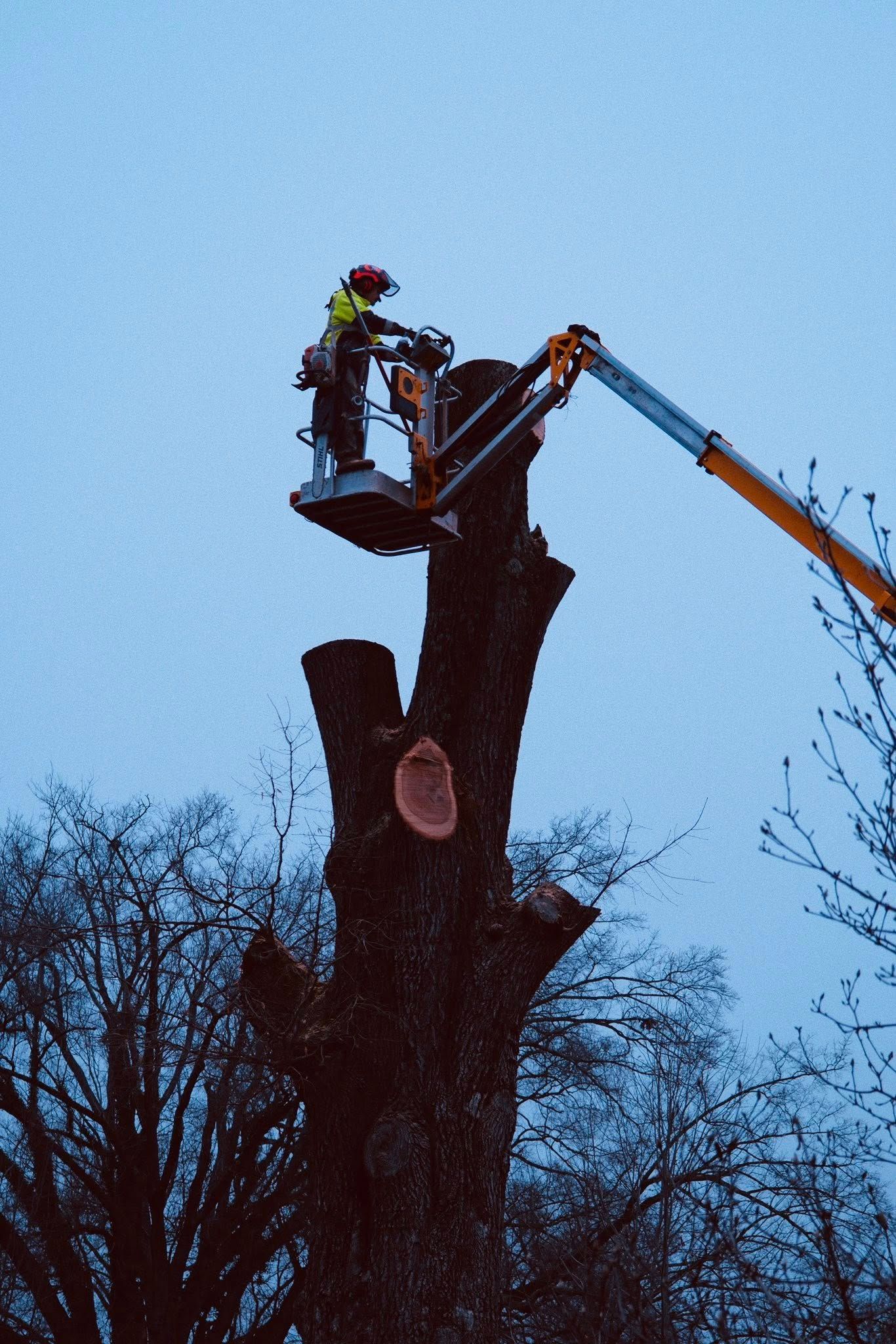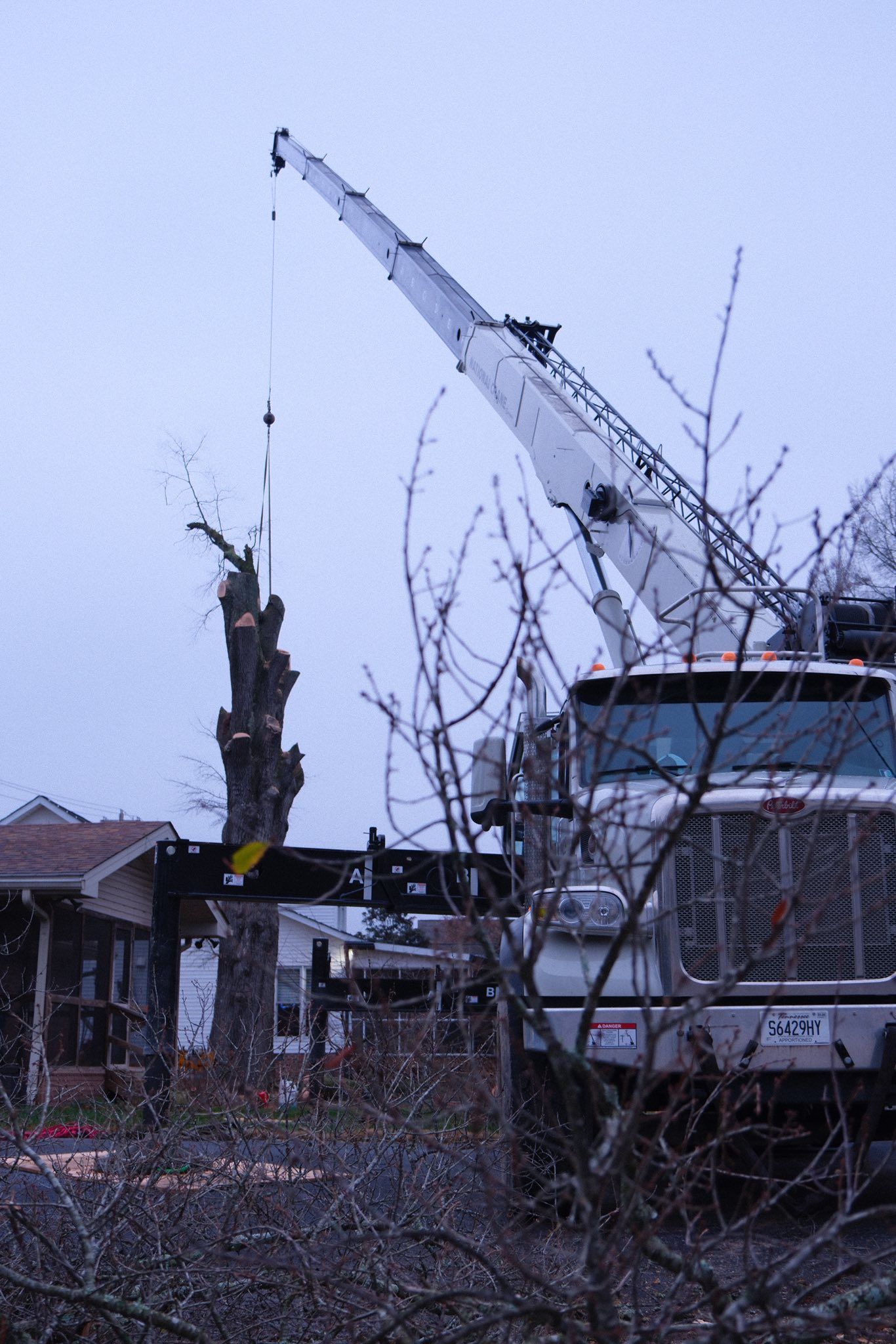 Crane-assisted removal for trees near structures or difficult terrain, minimizing ground disturbance and protecting surrounding vegetation